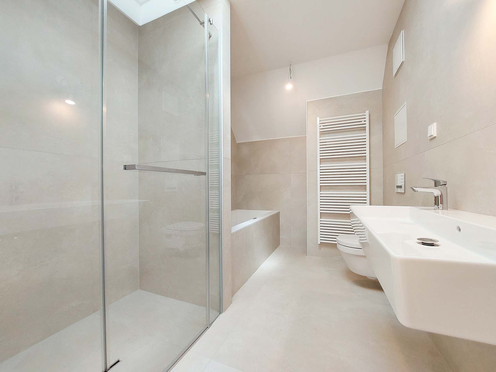 - Großzügiger Duschbereich mit bodenebener Dusche und mit Edelstahlrinne und rahmenloser Echtglasabtrennung