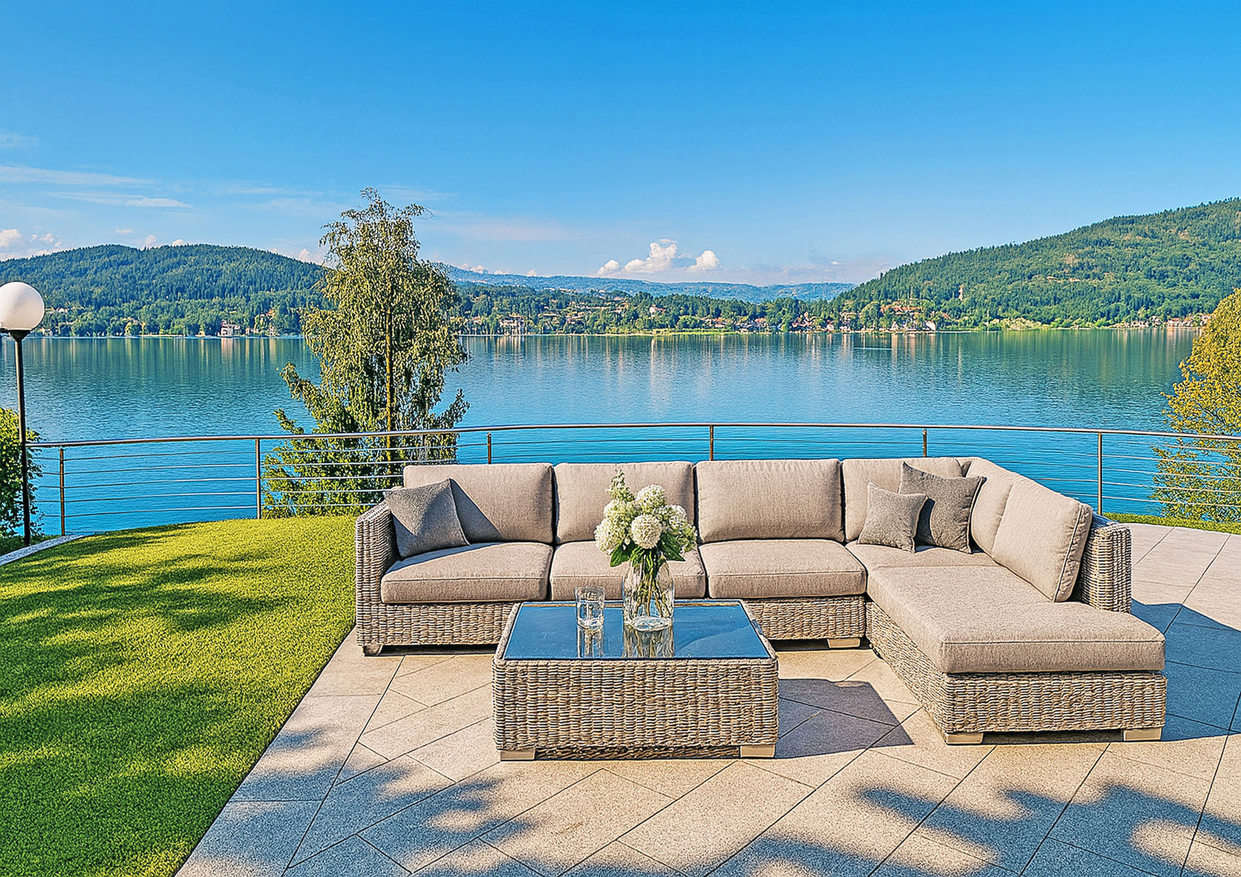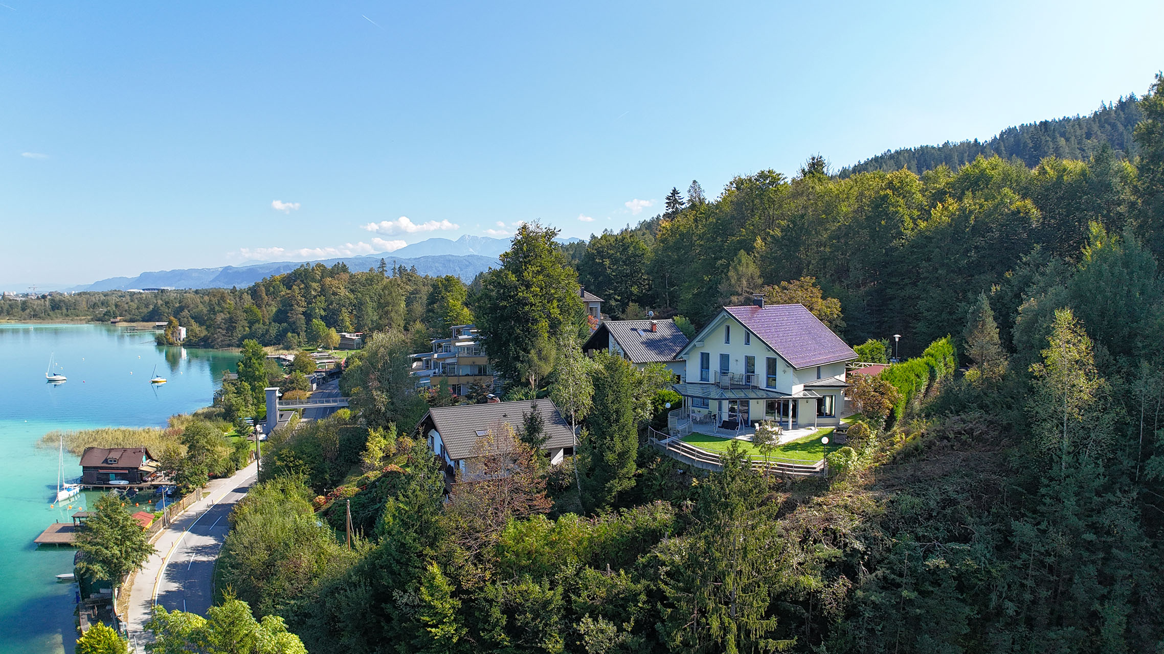 An einem der exklusivsten Plätze am Wörthersee – am Gustav-Mahler-Weg in Maiernigg – thront diese elegante Seeblickvilla über dem türkisblauen Wasser. Die Liegenschaft bietet absolute Privatsphäre, eingebettet in ein Landschaftsschutzgebiet, und eröffnet einen der spektakulärsten Panoramablicke des gesamten Sees: von Pörtschach über Krumpendorf bis zur Ostbucht Klagenfurt.