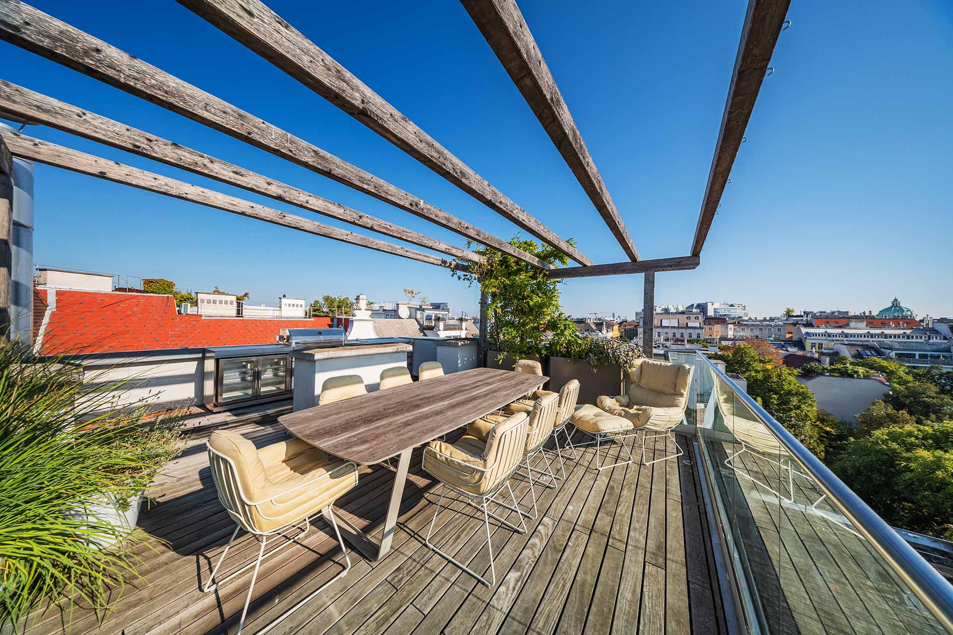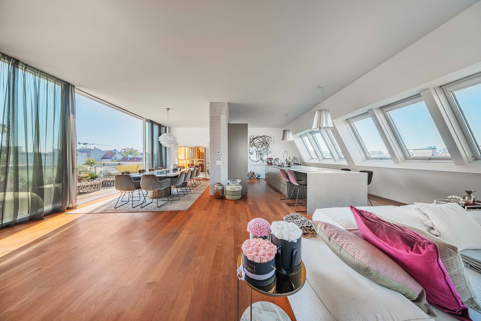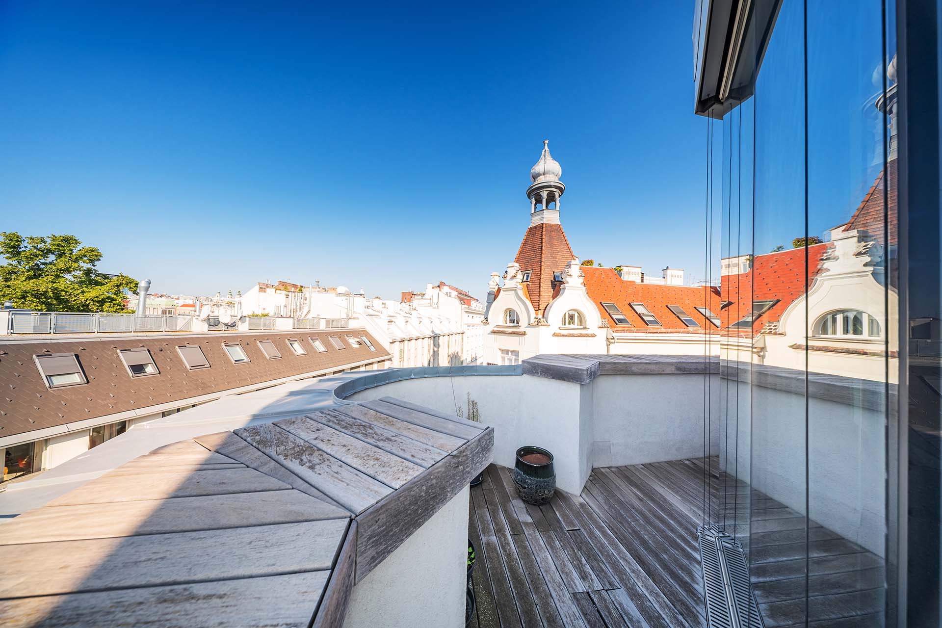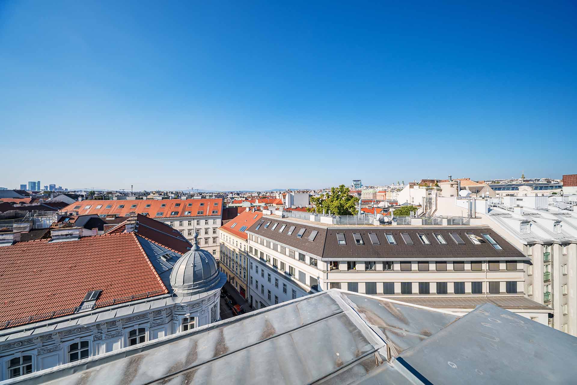 Diese Penthouse-Residenz begeistert mit außergewöhnlichen Außenflächen und einem atemberaubenden Blick über die Dächer Wiens. Die Dachterrasse wird zum privaten Rückzugsort über den Dächern der Stadt.