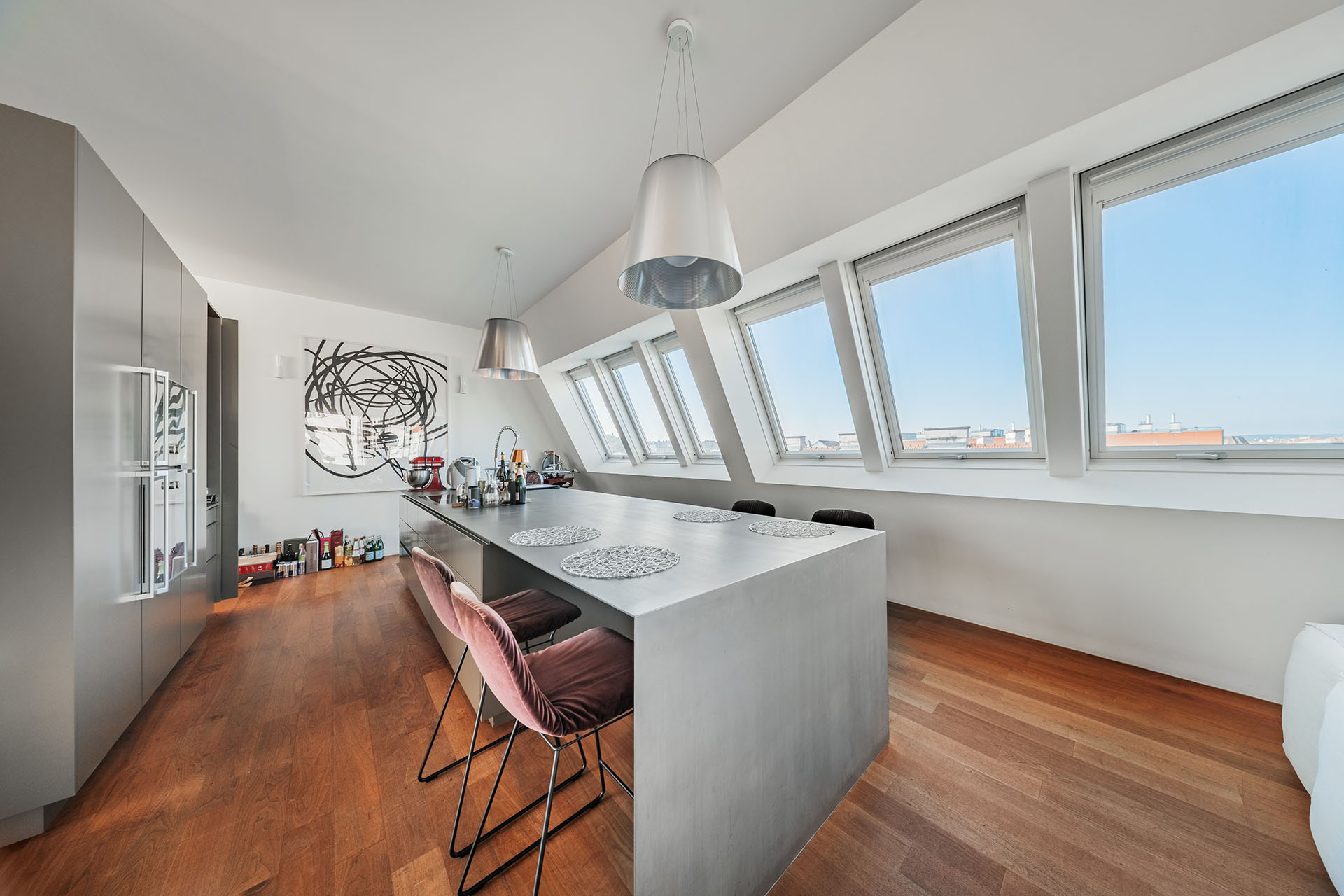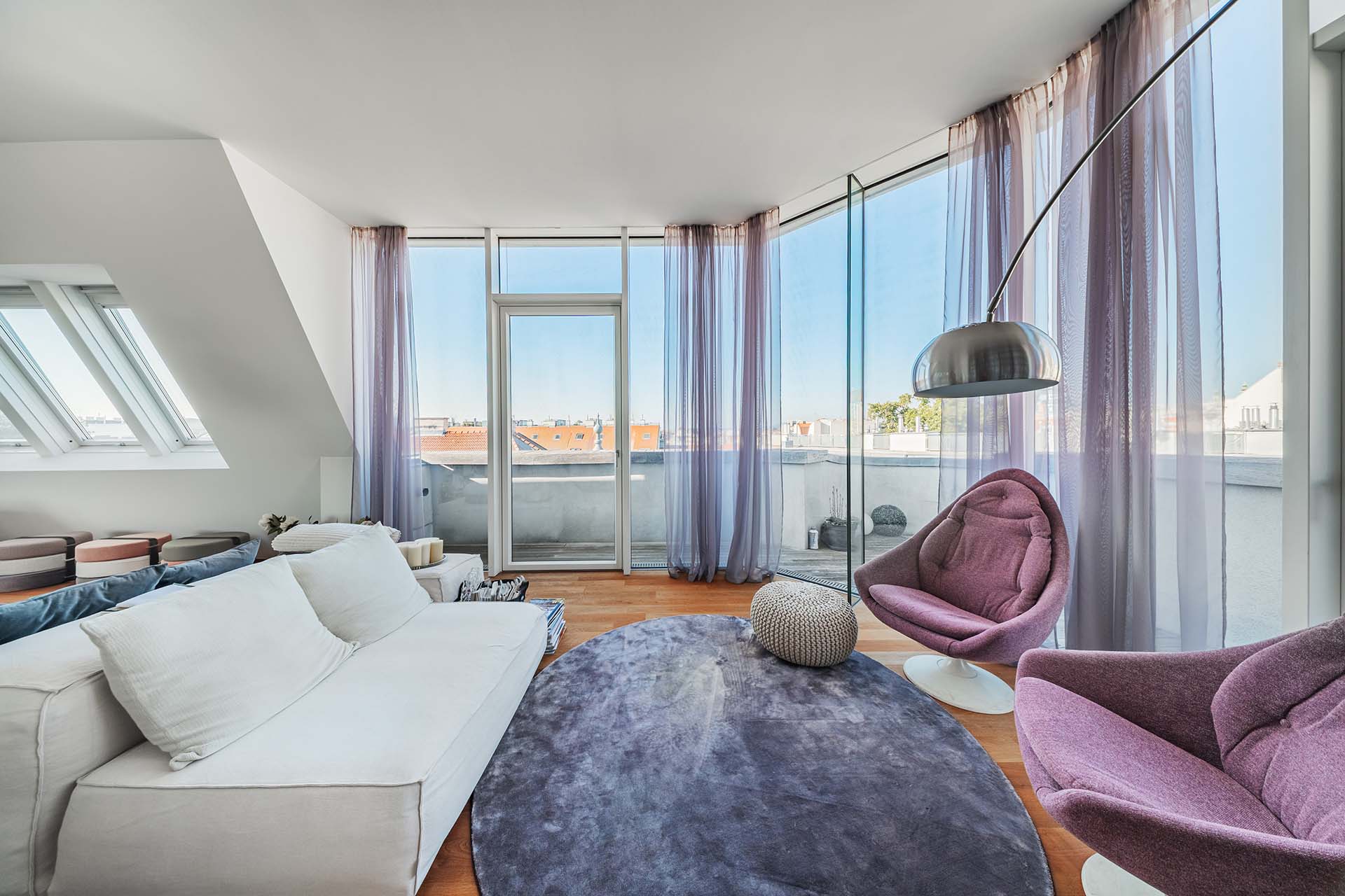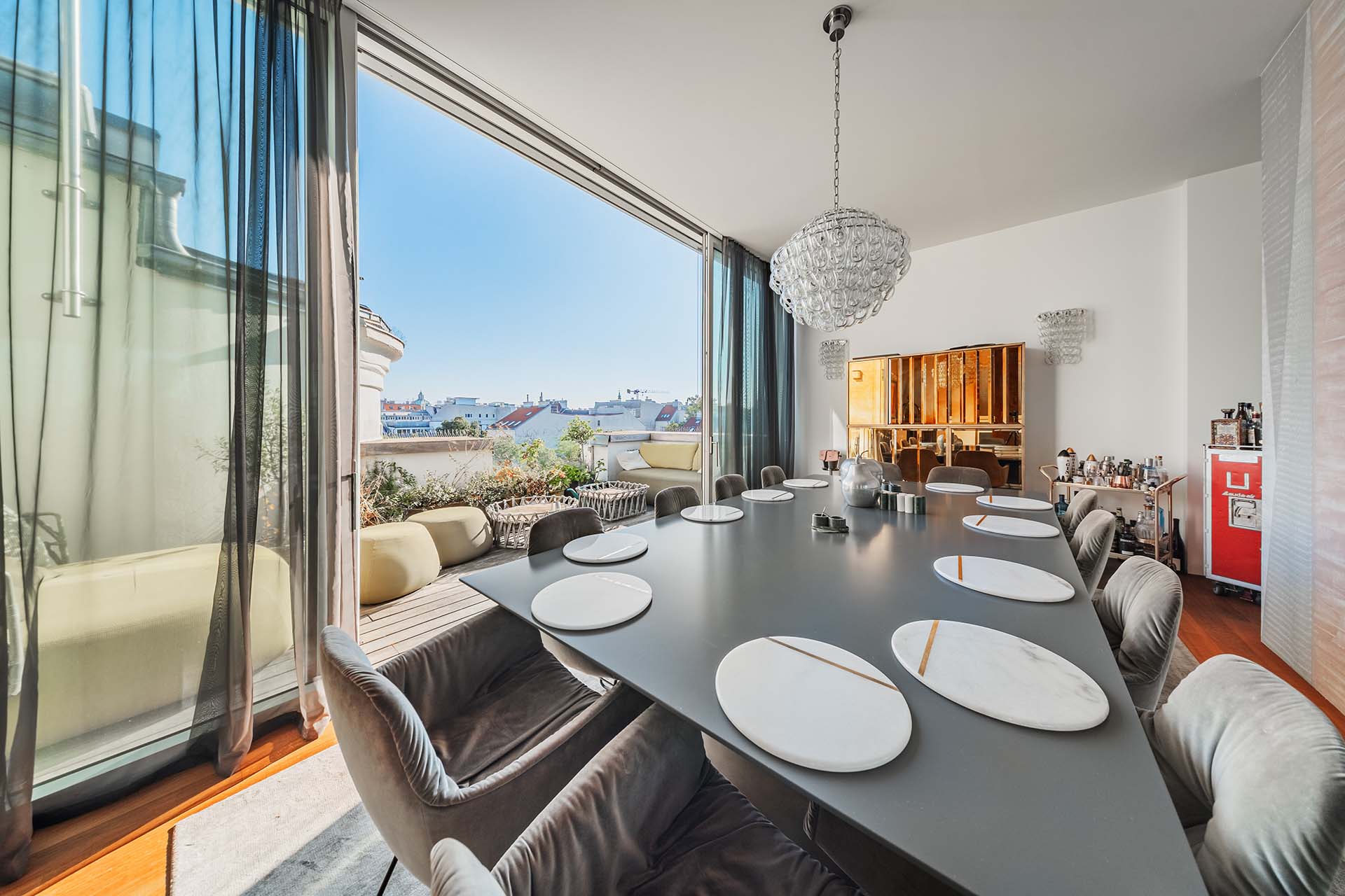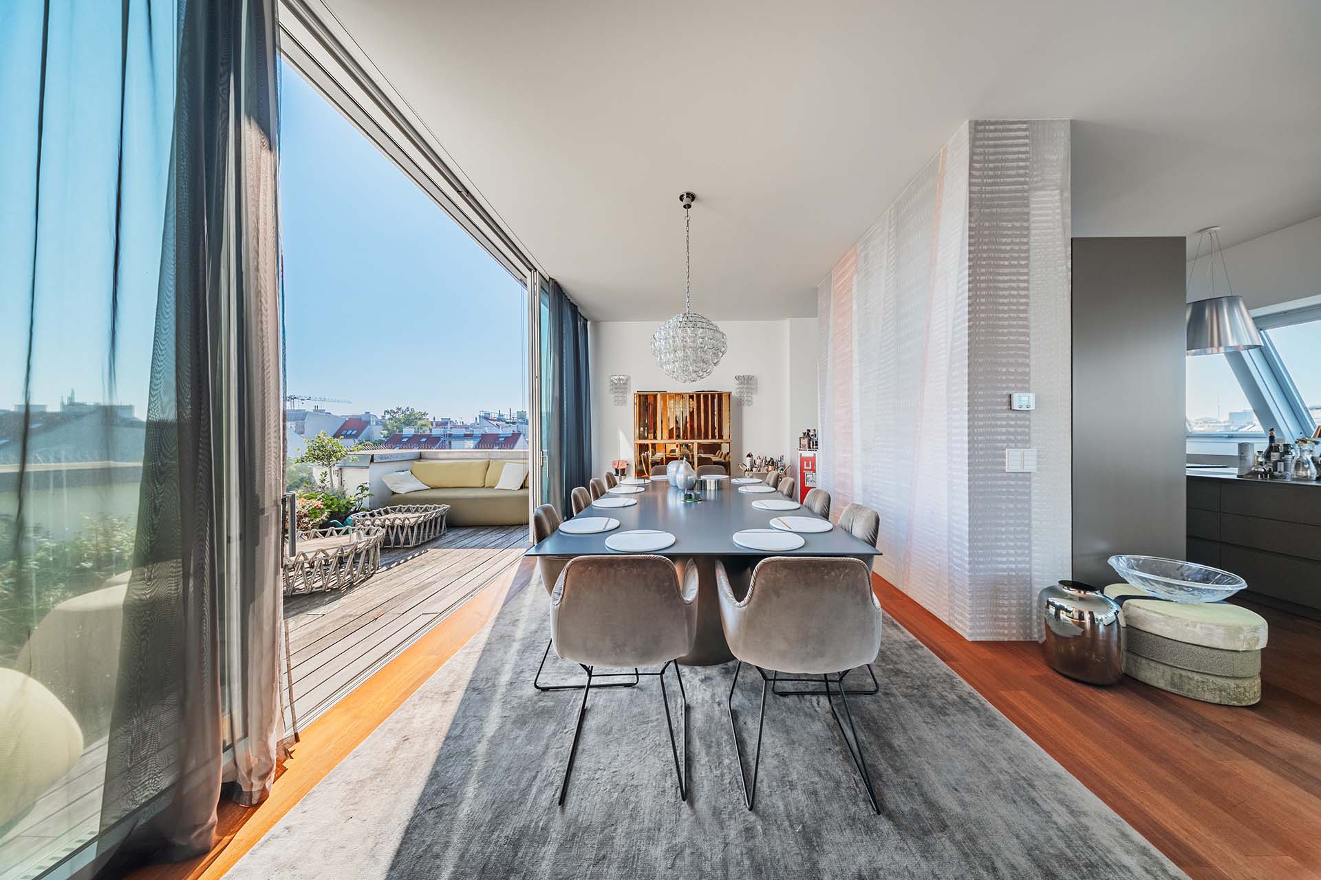 Diese Penthouse-Residenz begeistert mit außergewöhnlichen Außenflächen und einem atemberaubenden Blick über die Dächer Wiens. Die Dachterrasse wird zum privaten Rückzugsort über den Dächern der Stadt.