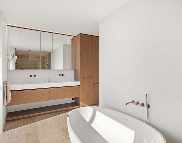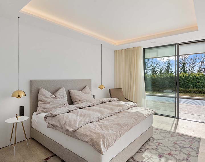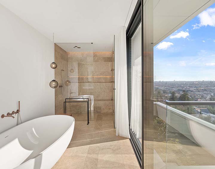 Der Masterbereich erstreckt sich über die gesamte oberste Ebene und bietet eine private Panoramaterrasse, Bad en suite und begehbare Garderobe.
