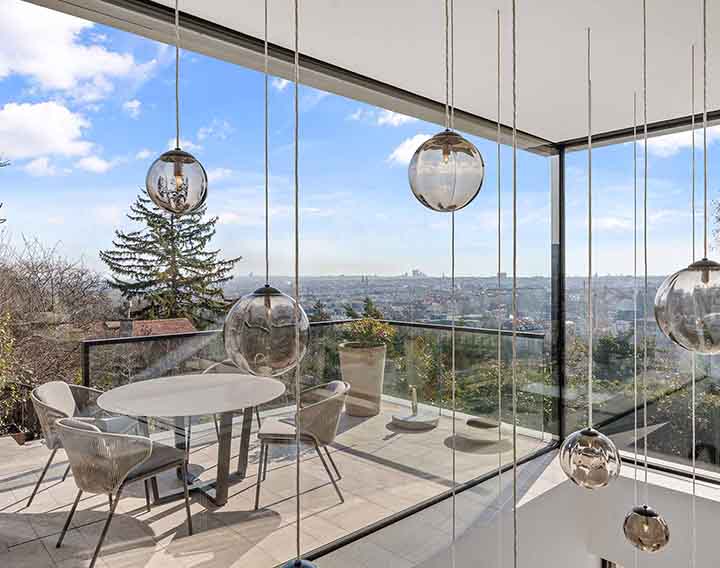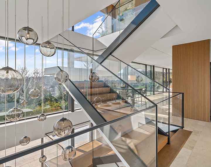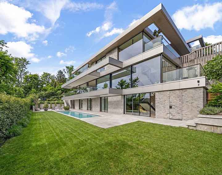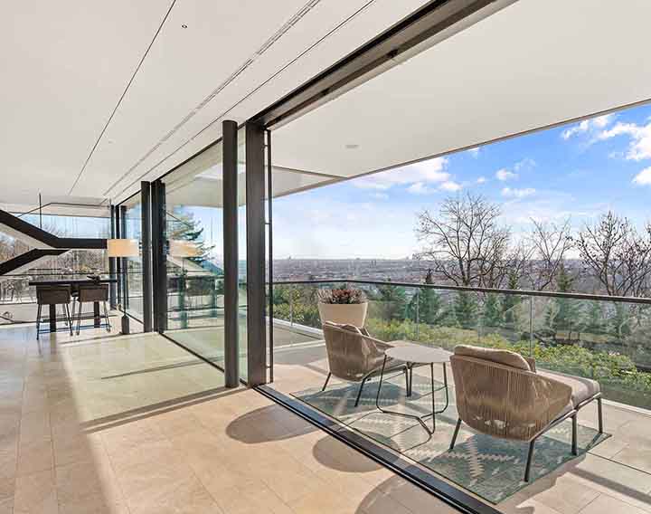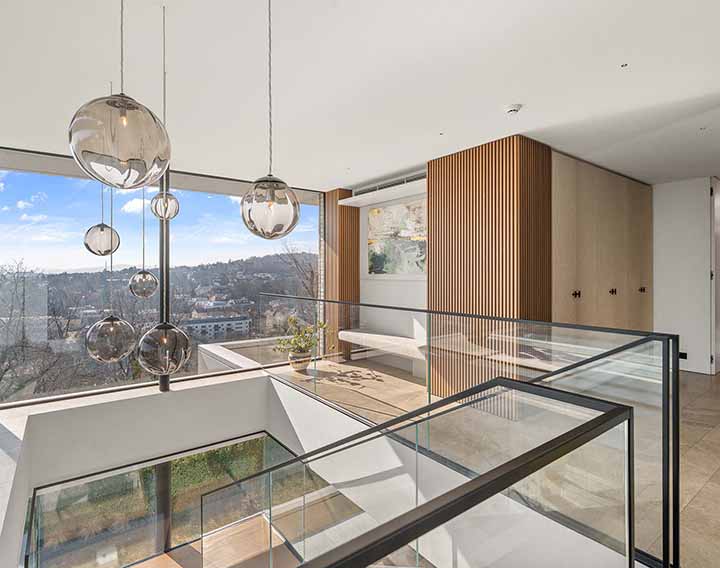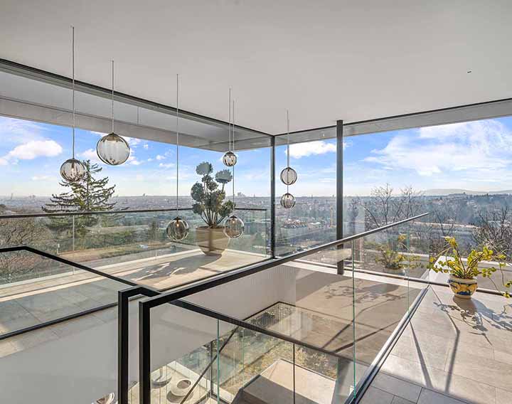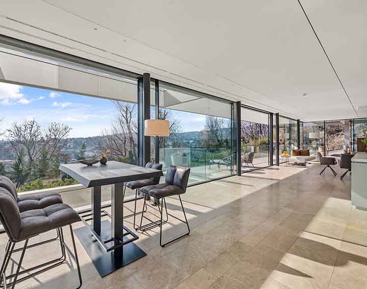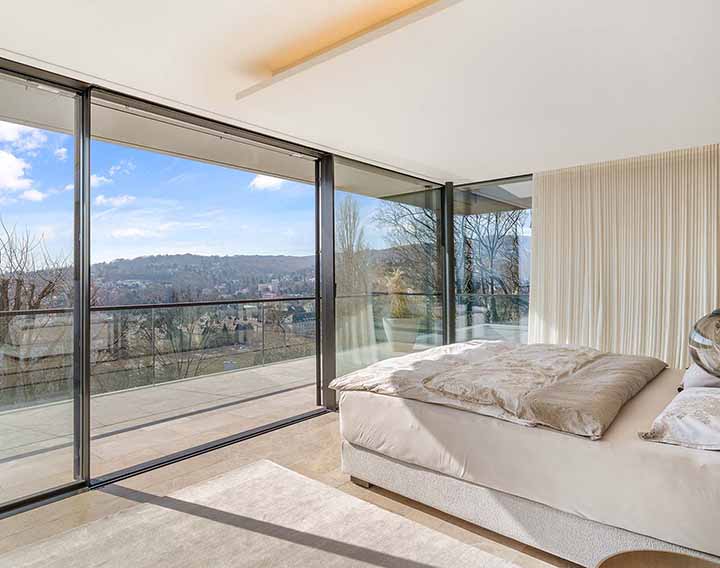Uneinsehbar gelegen und über eine private Zufahrt erschlossen, verbindet dieses exklusive Anwesen absolute Ruhe mit einem spektakulären Panorama über die Stadt. Großzügige Glasflächen auf allen Ebenen öffnen die Architektur zur Landschaft und schaffen fließende Übergänge zwischen Innen- und Außenraum.