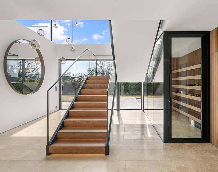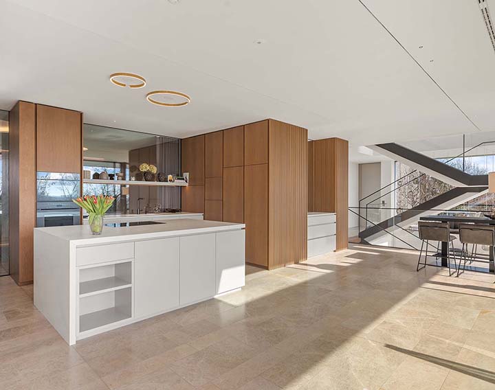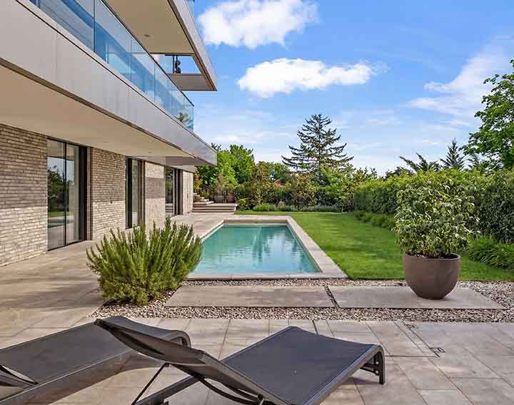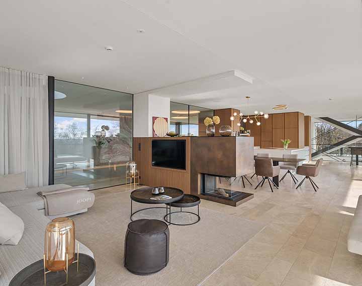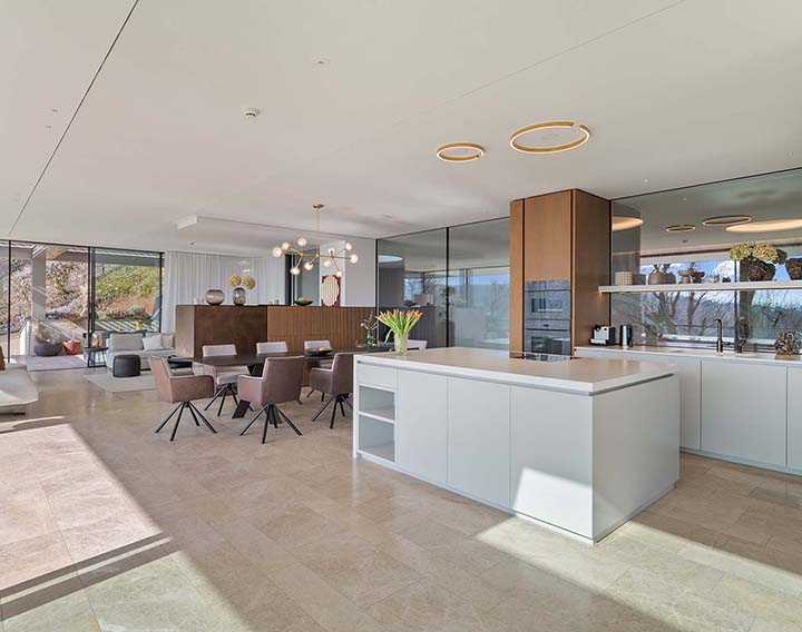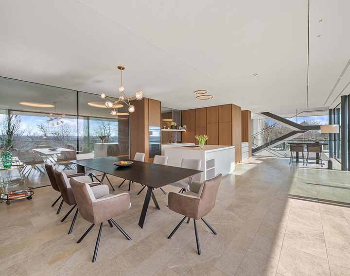 Die Architektur folgt einem klaren Prinzip: Großzügigkeit, Licht und fließende Übergänge zwischen Innen- und Außenräumen. Große Glasflächen und weitläufige Blickachsen prägen das Wohngefühl.