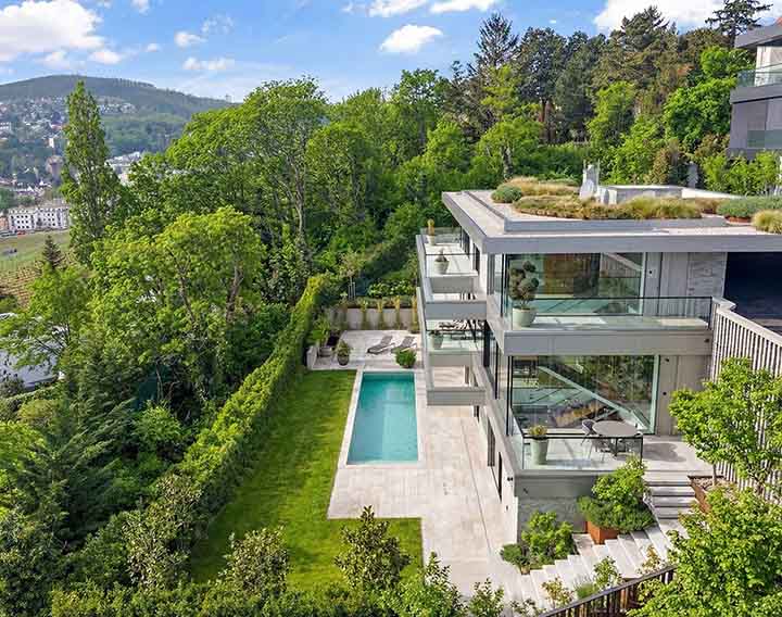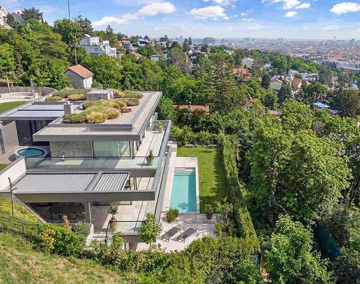 Hoch über Wien, am begehrten Südhang des Schafbergs, erhebt sich das HILL HOUSE – eine außergewöhnliche Privatresidenz, die Architektur, Privatsphäre und Weitblick in perfekter Balance vereint.