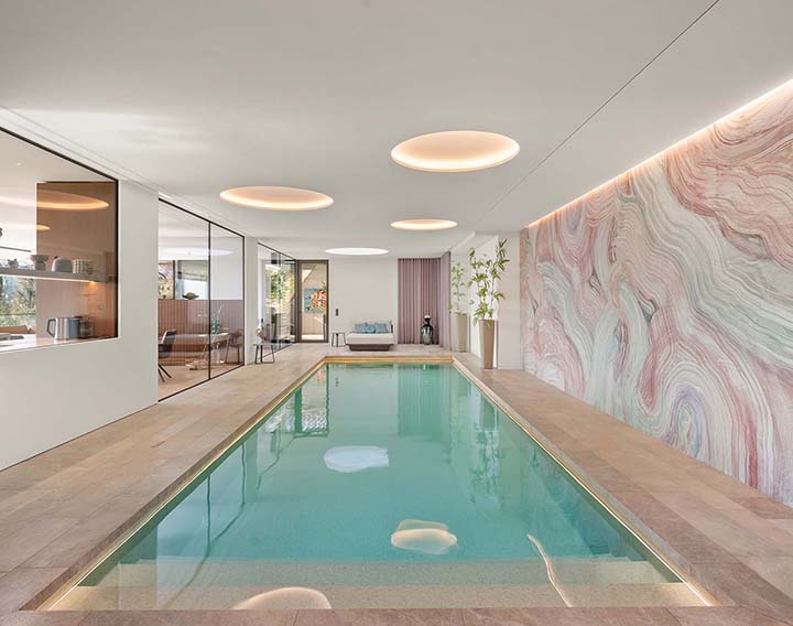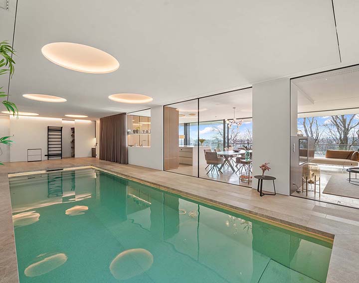 Wellness und Entspannung bilden einen zentralen Bestandteil des Hauses – mit Indoor-Pool, Sauna, Dampfbad, Fitnessbereich, großzügigen Terrassenflächen sowie einem ca. 12 Meter langen Salzwasserpool im Garten.